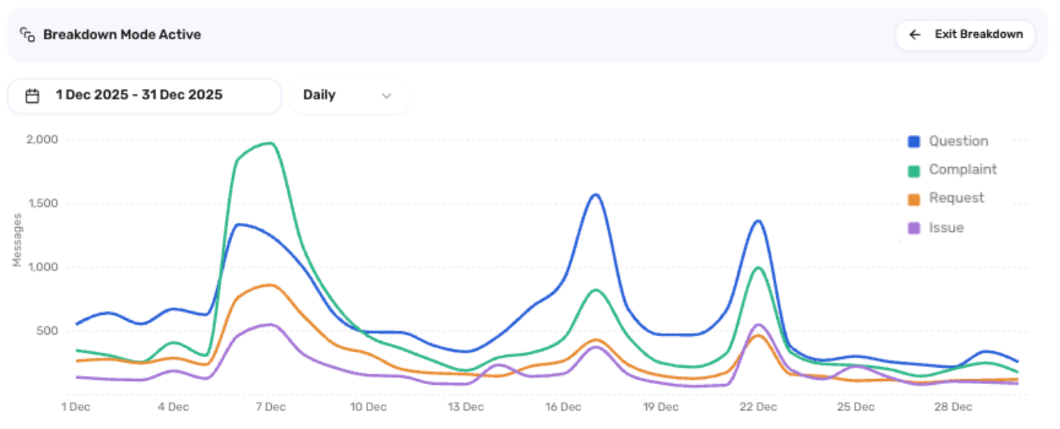 30% of messages were related to questions; nearly 25% of messages were related to complaints; 13% of messages were related to requests, and 10% of messages were related to issues.