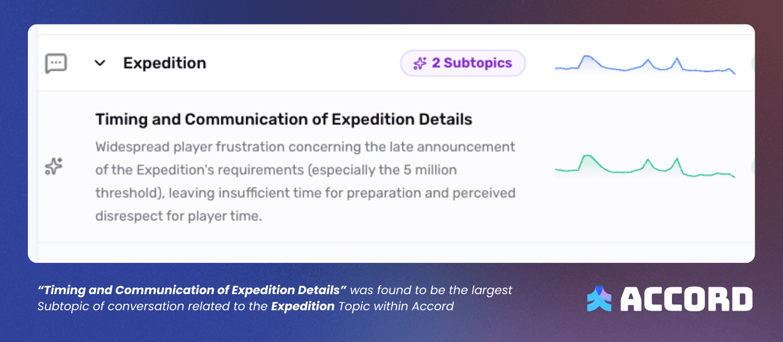 20% of these messages focused on the timing and communication of the Expedition details. Accord automatically creates new sub-topics according to trending topics in Discord, and a new sub-topic for ‘Timing and Communication of Expedition Details’ was created with over 10,000 messages.
