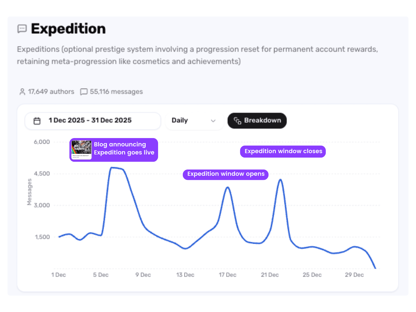 Messages relating to the game’s Expedition system, with clear spikes on the clarifying blog post from 6th December and the Expedition window closing on 22nd December.